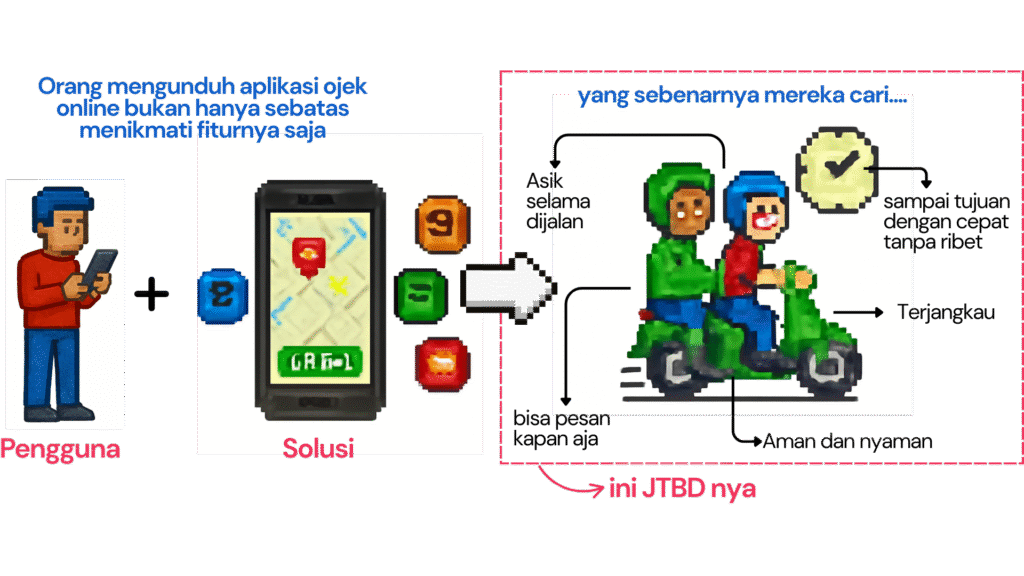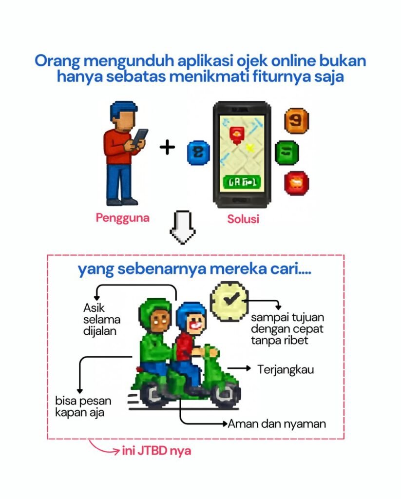 JTBD adalah cara berpikir untuk memahami apa yang ingin dicapai atau diselesaikan oleh pengguna Anda sehingga solusi yang ditawarkan tepat sesuai dengan kebutuhannya.